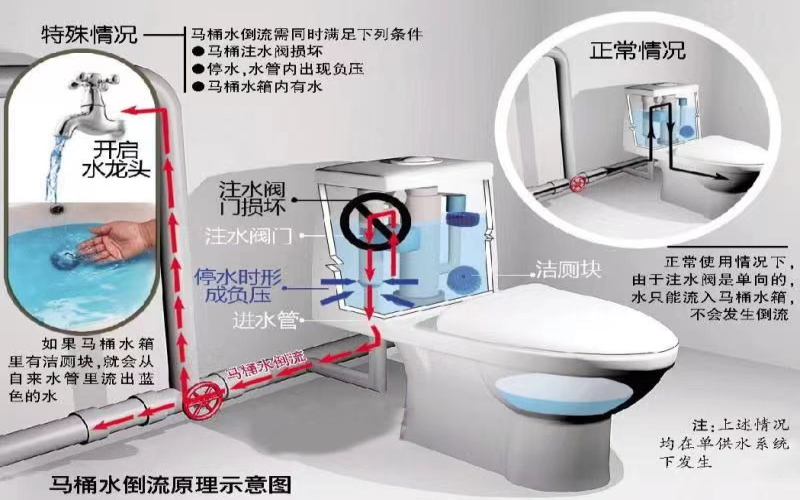 個(gè)別用戶發(fā)現(xiàn)從水龍頭中放出的自來(lái)水有時(shí)會(huì)呈現(xiàn)藍(lán)色。出現(xiàn)這種現(xiàn)象是因?yàn)橛脩粼趲鋬?nèi)放有潔廁靈(藍(lán)色),同時(shí)馬桶進(jìn)水管止回閥損壞導(dǎo)致。正常情況下,在管網(wǎng)壓力的作用下,水的流向是正向的。但由于停水或者樓下有用水,在開啟閥門或水龍頭的瞬間,由于水流的突然變化,使樓上未用水的管道內(nèi)產(chǎn)生了瞬時(shí)負(fù)壓,將水箱內(nèi)的水抽入管道內(nèi),即產(chǎn)生了藍(lán)水現(xiàn)象。只需加裝止回閥,即可解決問(wèn)題。