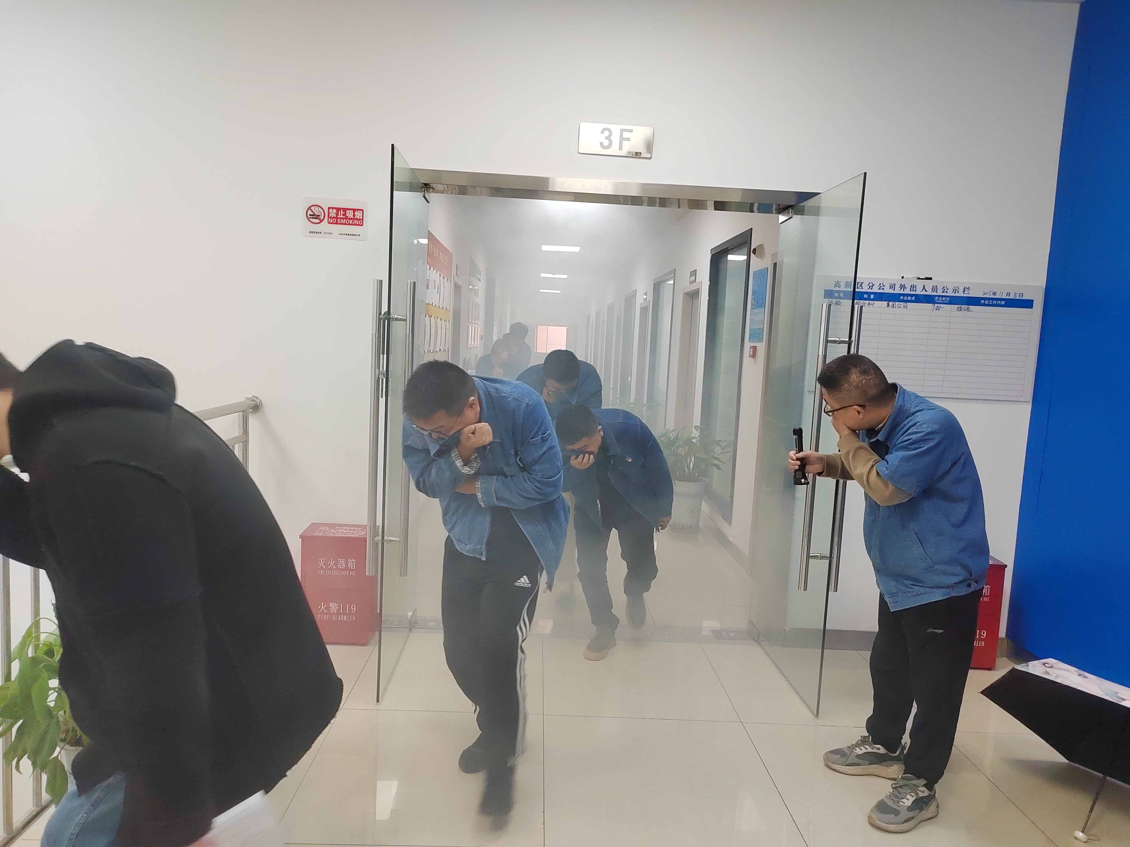 消防疏散演練模擬現(xiàn)場。警報(bào)聲響起,全體員工迅速行動(dòng),彎腰低頭、捂住口鼻,按預(yù)定路線有條不紊穿過“火災(zāi)煙霧現(xiàn)場”。整個(gè)過程中,員工嚴(yán)格遵守要求,冷靜應(yīng)對,展現(xiàn)良好應(yīng)急反應(yīng)能力。