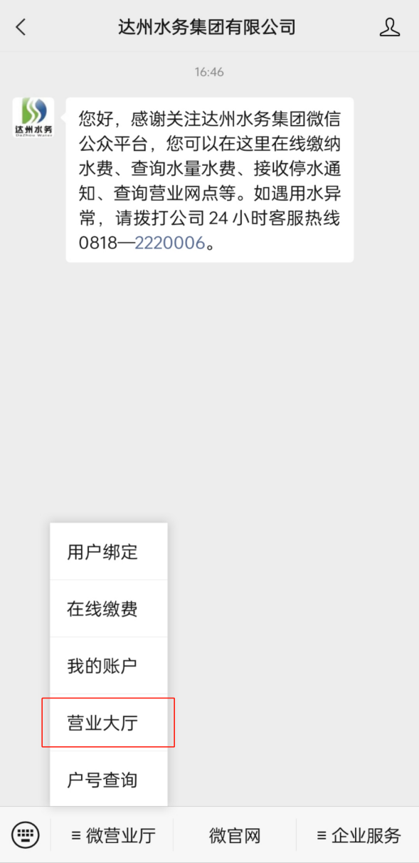 關(guān)注“達州水務集團有限公司”公眾號,點擊“微營業(yè)廳”中的“營業(yè)大廳”。