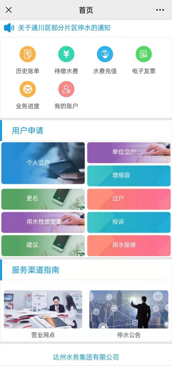 達州水務“微營業(yè)廳”已正式進駐“達州水務集團有限公司”微信公眾號,關(guān)注微信公眾號,多項供水業(yè)務均可網(wǎng)上辦理。用水報裝、更名過戶、增縮容、用水性質(zhì)變更、用水報修、水費查詢、充值繳費、電子發(fā)票下載等業(yè)務均可“掌上辦”。