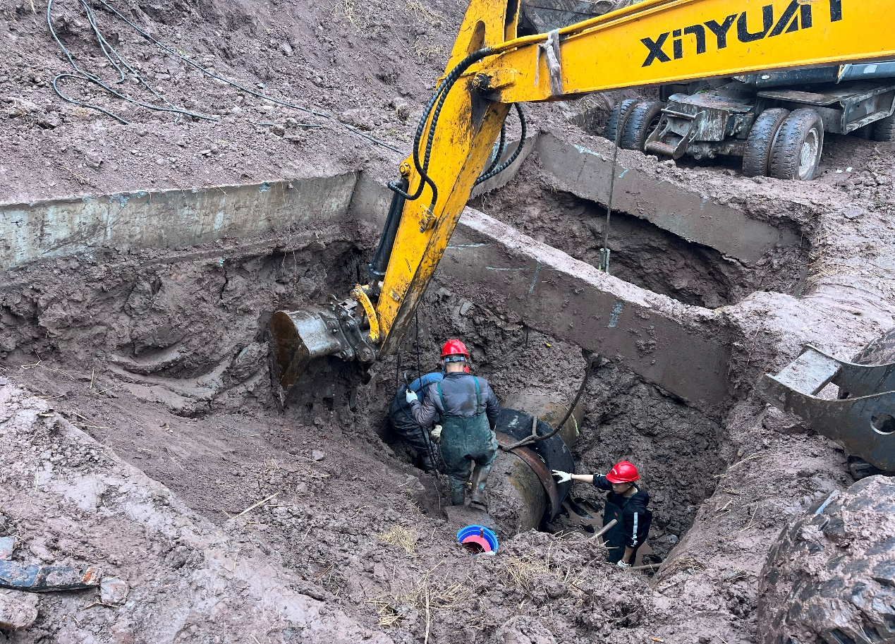 險情發(fā)生后,水務(wù)集團黨委高度重視,黨委書記、董事長盧輝帶隊奔赴搶險現(xiàn)場指揮調(diào)度,要求惠泉公司立即組織搶修,盡快恢復(fù)管網(wǎng)運行,盡最大努力減少污水外溢,集團安全環(huán)保部、規(guī)劃建設(shè)部、惠潤達公司到場指導(dǎo)協(xié)助?;萑绢I(lǐng)導(dǎo)班子立即召開緊急現(xiàn)場會,連夜組織調(diào)度搶險人員和設(shè)備,出動搶險人員100余人次,挖掘機、吊車、多功能搶險車等工程機械10余臺,合理調(diào)配人手,組建臨時班組,采取人機輪班,就地休息的方式,在確保安全的情況下,迅速開展搶險工作。