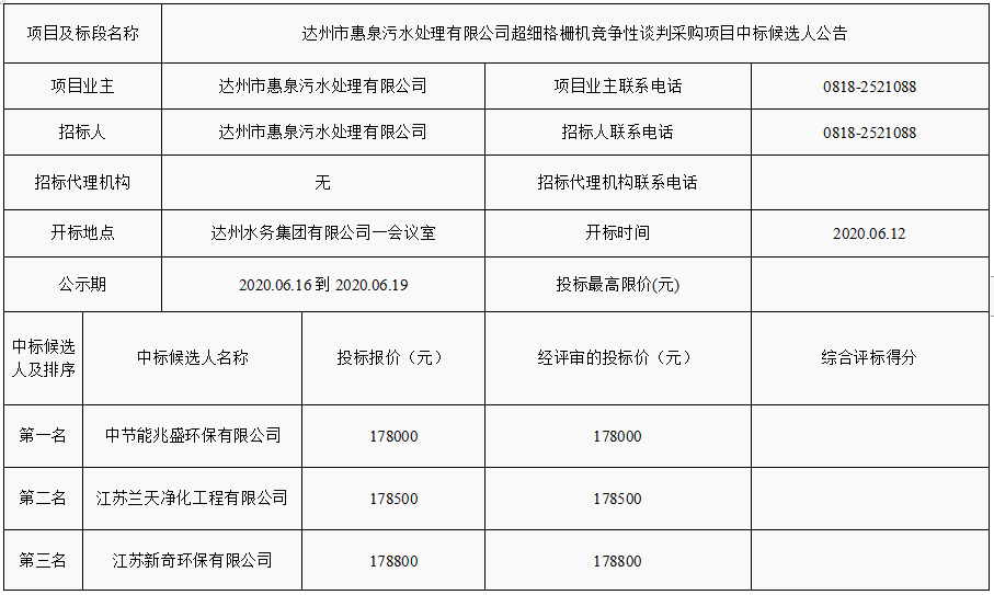 下一篇:達州市惠泉污水處理有限公司2020年度水處理藥劑(除磷劑)采購項目中標(biāo)候選人公示